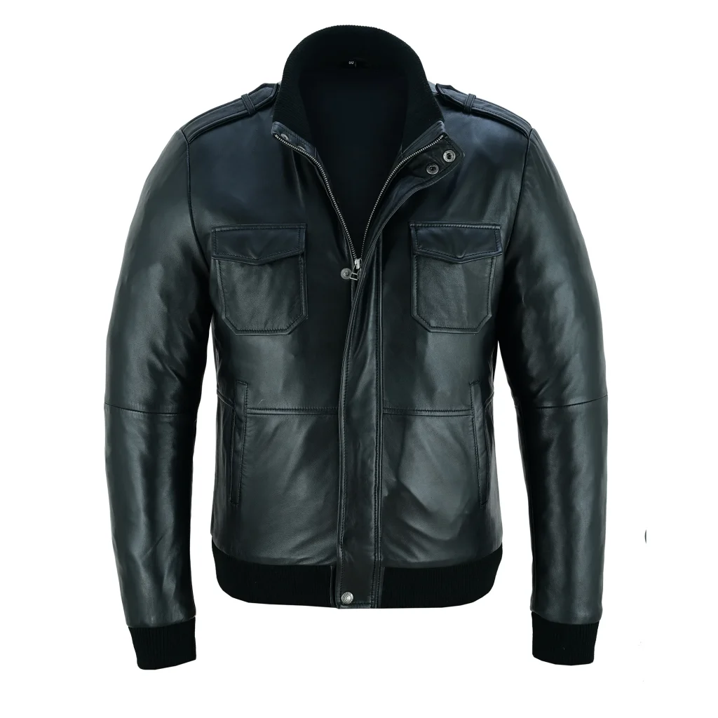 Black Stand Collar Leather Jacket for Men