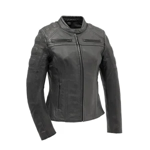 This women’s padded leather motorcycle jacket is designed for riders who want a balance of protection, comfort, and clean modern