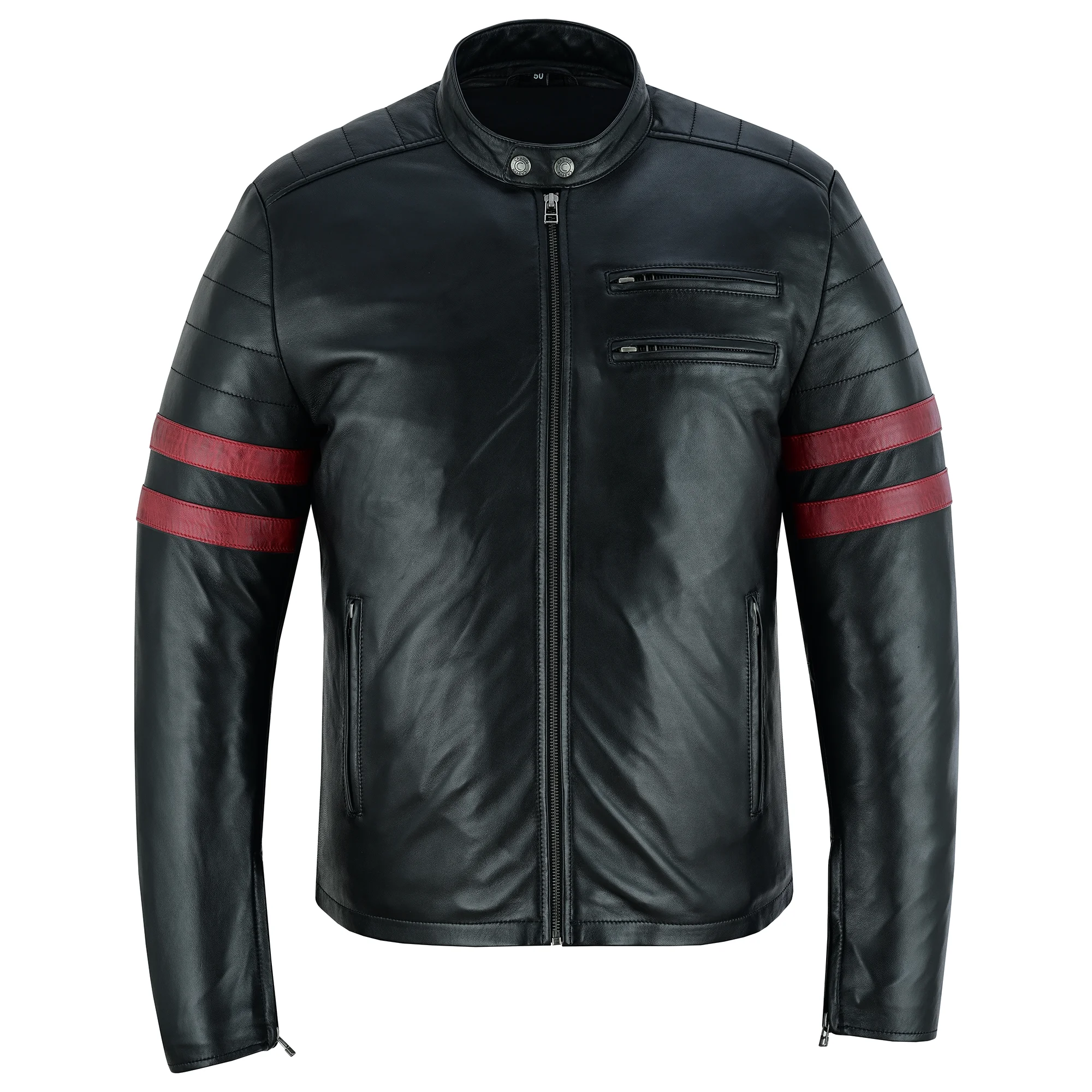 This black leather racing jacket for men is crafted for a bold, modern look with premium comfort and durability. Made from 100% real lambskin leather, the jacket features a sleek zip-front design with signature contrast stripe detailing on the sleeves, giving it a sporty and contemporary edge.