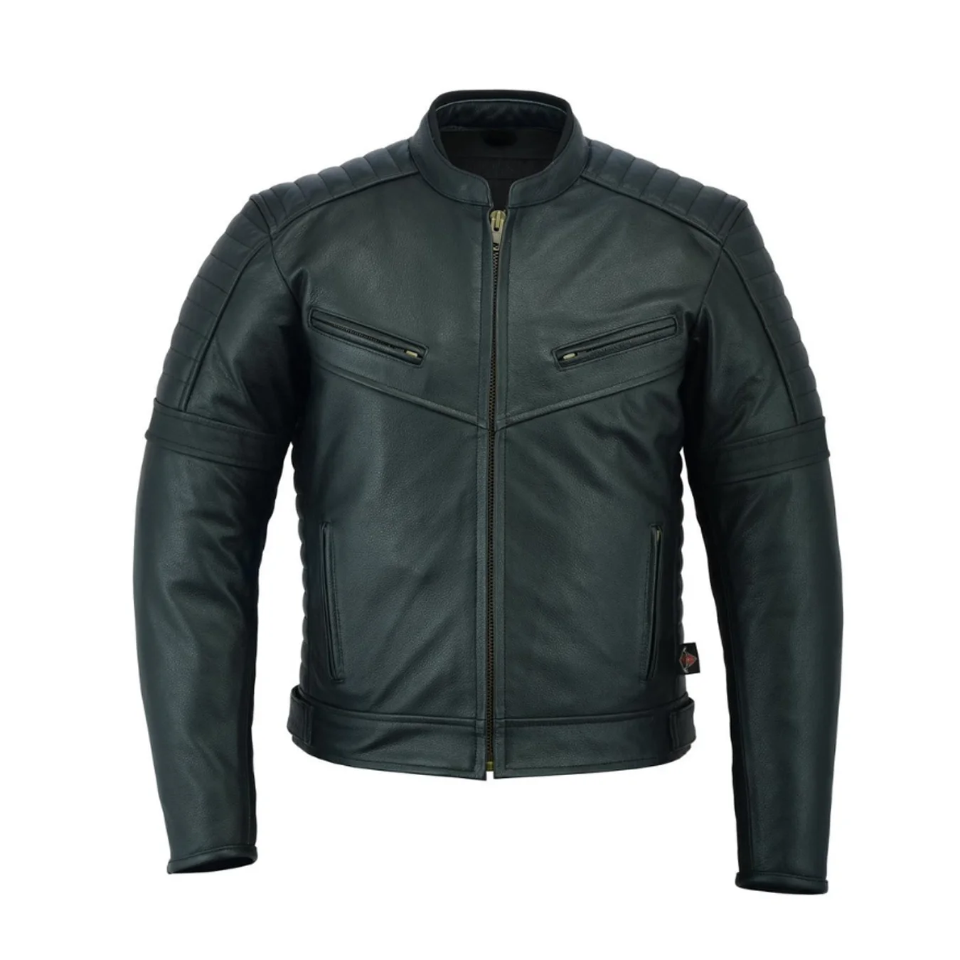 This men’s black café racer leather jacket features a clean, minimalist design inspired by classic motorcycle heritage. With its smooth