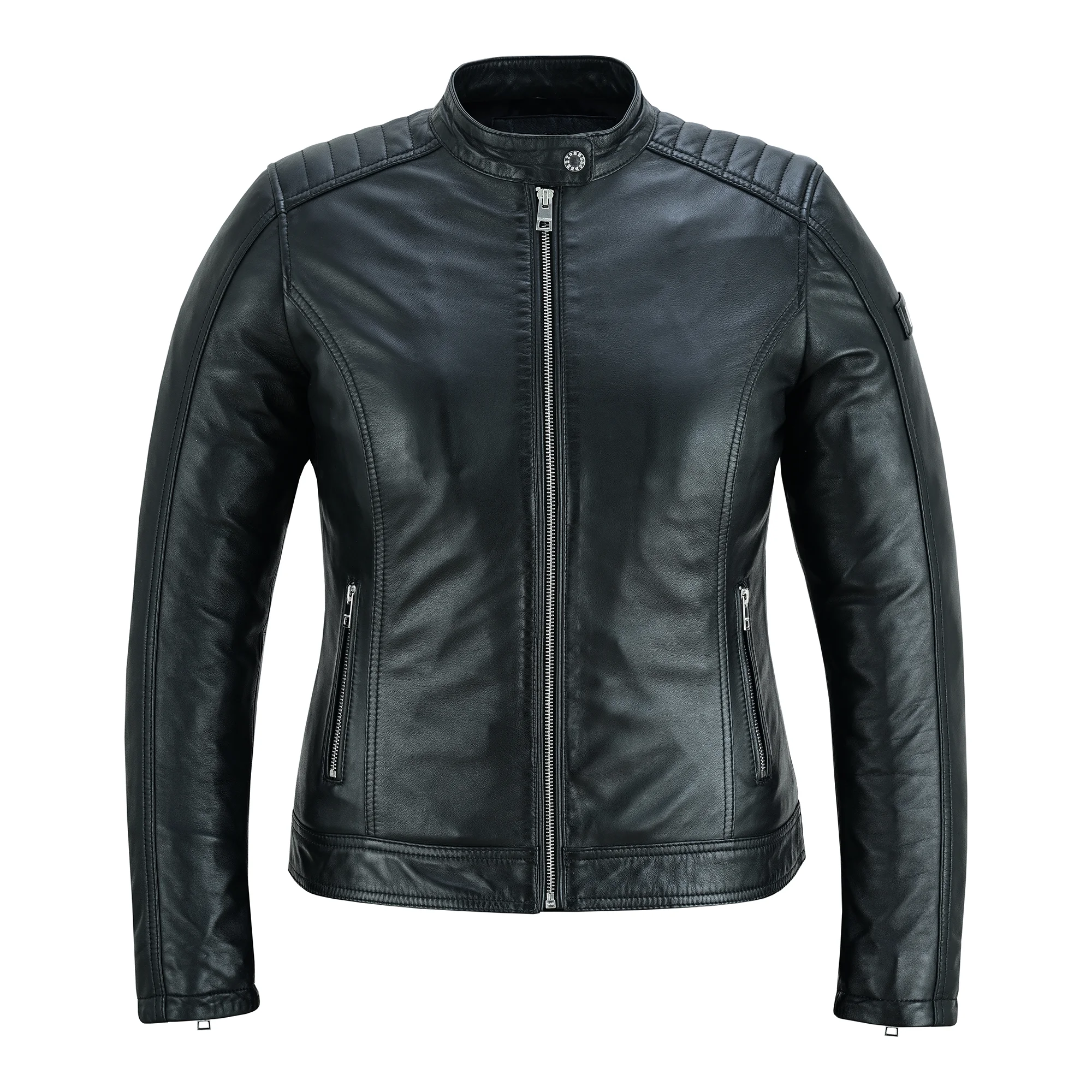 This women’s biker-style leather jacket is crafted for a confident, contemporary look. Made from 100% real sheepskin leather, it features lightly padded shoulder detailing and a structured design that adds character while maintaining a feminine silhouette.